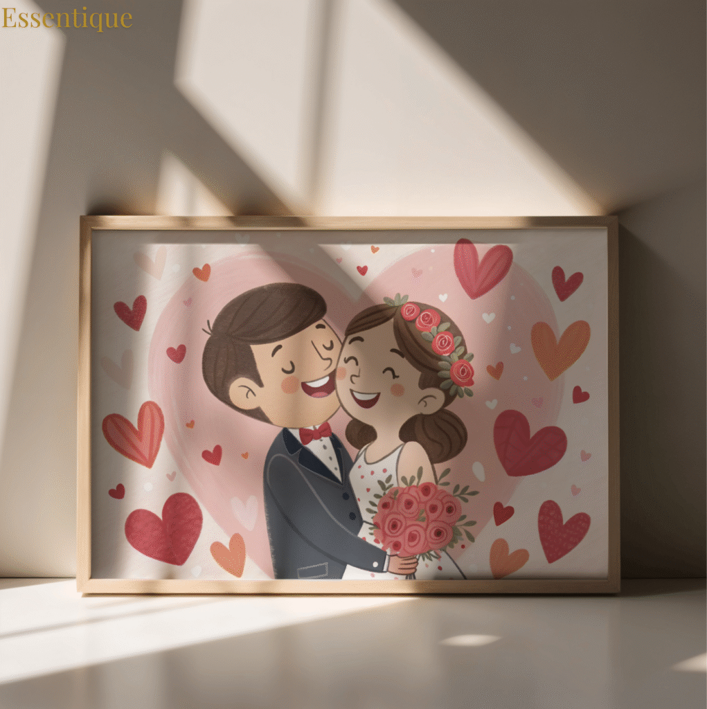 A romantic AI painting of a couple in their wedding attire printed on a canvas frame.