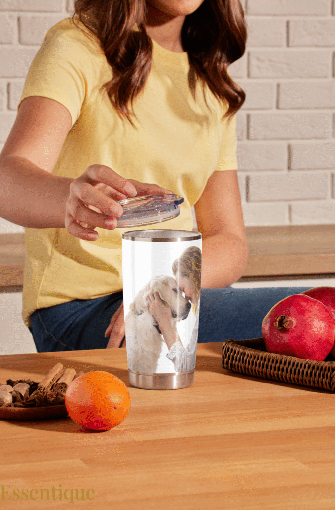 Cute AI-generated artwork of someone’s pet on a coaster or keychain or tumblers.