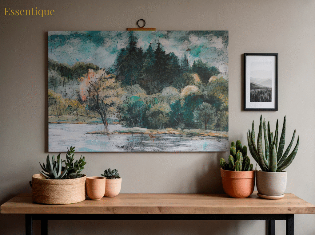 A stylish AI-generated nature scene printed as wall art for your living room.